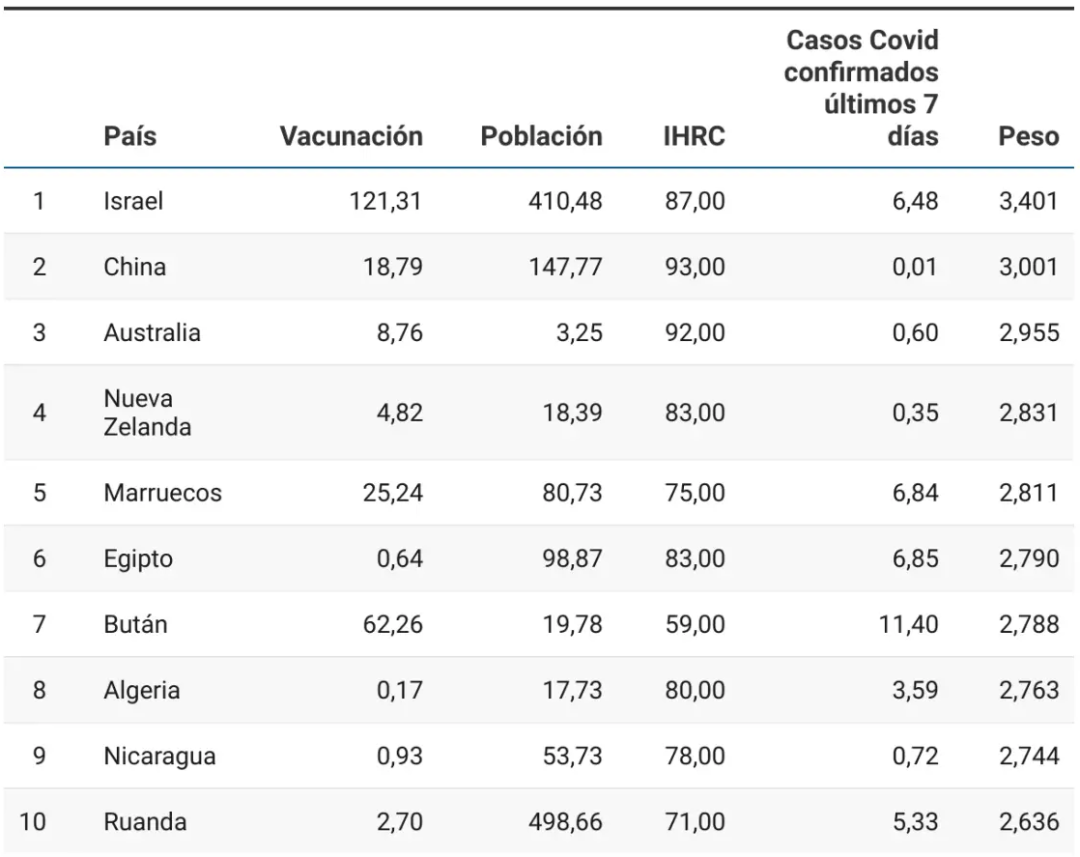 【该研究对结果进行了加权平均和归一化整理,使每一项的得分变成了0到1分,最后的总得分最低为0(最不安全的国家),最高为4(最安全的国家)】 1.以色列3.401分 数据显示以色列是世界上最安全的也是疫情最轻的国家。截至5月3日,以色列的疫苗接种率是世界上最高的。 2. 中国3.001分 中国在过去七天里报告的每10万人中仅有0.01例新冠感染病例,感染率是最低的。此外,中国在应对公共卫生风险的能力方面也排名第一。 3. 澳大利亚2.955分 澳大利亚极低的人口密度帮助其来到了排行榜的第三名。但是在5月3日之前的最后七天,平均每10万人中有0.6个确诊病例,也可以看出澳大利亚防控措施做得很好。 4. 新西兰2.831分 新西兰以2.831分在最佳排名中排名第四,平均每10万人中有0.35个确诊病例,仅低于中国。可以看出整个大洋洲国家在疫情防控方面都做出了很好的表现,当然这与它们的地理位置不无关系。 5. 摩洛哥2.811分 根据该报告,摩洛哥是非洲最安全的国家,因为它对国民进行了灵活的疫苗接种,接种率达到了25.24%,而且感染的发生率也很低。 6. 埃及2.790分 新冠肺炎感染率最低的第二个非洲国家是埃及,虽然该国目前的疫苗接种率很低,但是其它几项数据都非常不错,尤其是每10万人中的感染病例是6.85个。 7. 不丹2.788分 这个不知名的亚洲小国,长期被认为是世界上最幸福的国家之一。不丹因为其排名第二的高疫苗接种率(62.26%)而排到这份榜单的第七名。 8. 阿尔及利亚2.763分 阿尔及利亚是上榜的第三个非洲国家,虽然其疫苗接种率最低,仅为0.17%,但是因为其较低的人口密度和排名第五的低感染率,跻身排行榜的第八位。 9. 尼加拉瓜2.744分 尼加拉瓜是唯一上榜的美洲国家。该国上榜主要得益于极低的感染率,在5月3日之前的最后七天,平均每10万人中有0.72个确诊病例。 10. 卢旺达2.636分 至此,非洲国家占据了该榜单的四个席位,不得不说这出乎人们的意料。卢旺达是这10个国家中人口密度最高的一个,但是其每十万人感染病例仅为5.33个,这就是它上榜的原因。 摘译自elmundo.es