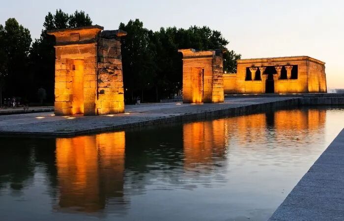 在马德里,德波德神庙会让你了解一点古埃及文明。它是1968年埃及送给马德里市的礼物。这是一座公元前2世纪的寺庙,由于时间的流逝,它也有相应的维修,一直保存到现在。由一位梅洛依特国王开始,几位托勒密君主扩大,罗马皇帝完成,它被遗忘了12个世纪,淹没在尼罗河水底并被拯救,它为我们提供了一个穿越2200年的历史的令人兴奋的旅程。它位于西班牙广场和品德罗萨莱斯走廊(Paseo de Pintor Rosales)的西部公园(Parque del Oeste)旁边。欣赏它的最佳时间是在黄昏,趁着夜幕降临的时候沉思,是一种感官上的奇观。
