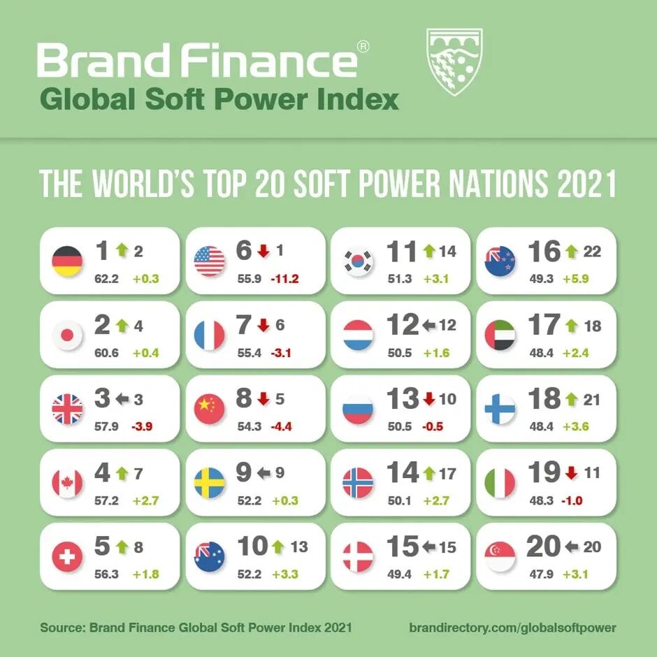 在经历了一年的国家封锁、人员流动限制和社会疏离之后,各国对疫情防治的不同做法极大地影响了人们对国家软实力的评价。新西兰和澳大利亚等国因为反应迅速而有效,并及早实施了封锁和严格的边境限制,使得其排名上升。相比之下,有13个国家的软实力指数得分则因为疫情防控不力而全面下降。