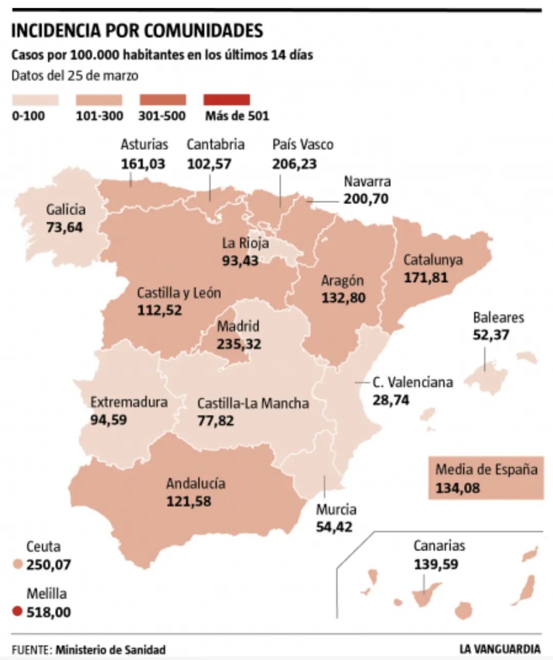 无约束的马德里Mayor广场 马德里由于疫情的管控,被Cantabria总统Miguel Ángel Revilla在一次私人谈话中评为定时炸弹。Revilla 说,圣周过后十二天,马德里的疫情发病率将达到高峰。以在马德里旅行中看到的情况证实这些话: 夜间拥挤的餐厅,“一半以上”的顾客没有口罩。这不仅是Revilla的看法,来自其他自治区的许多西班牙人几个月来一直受到严格的限制,尤其是在夜生活中,他们对所谓的比疫情情况更接近正常生活的现象感到惊讶。宽松的措施已超越边界。 这些看法具有客观依据,但是区域卫生负责人几乎无法传达这些看法。在至少一个月的时间里,马德里每天发病率达西班牙日增总病例40%左右。这些负责人证明了这些数字的合理性,因为马德里是人口密度最高,西班牙最大的城市。就公共卫生专家而言,正是出于这个原因,他们认为马德里的措施至少应在夜间、社交接触和人口流动方面更加严格。他们以伦敦采取的措施为例,人口密度远比马德里大得多。 自第三波疫情爆发以来,马德里是唯一一个没有将其发病率降低到每10万居民200例以下的自治区,西班牙大部分地区的累计发病率开始急剧下降。目前,这一数字为每10万居民235.32例,仅落后于Ceuta和Melilla自治市。该数字不断上升,再次接近极端警戒状态(每10万居民250例)。 目前处境:发病率持续上升,马德里即将恢复到最高警戒线 在上个月,马德里发现的病例占整个西班牙的35%(2月26日),最后一周(3月25日,40.5%)占至40%以上。这不可避免地导致医院入住率的增加。 马德里目前是仅次于Ceuta 和Melilla的第三大常规床位占比最高的地区(11.9%)。至于ICU床位,情况更严重。迄今为止,马德里是重症监护病房床位比例最高的第二个地区,该比例上升至34%,仅次于Ceuta自治市。在第三波疫情爆发的最高峰(1月下旬),ICU的占用率达到了50%。在两个月的时间里,它已经下降了15点左右,如果发生第四波疫情,则降幅不足。 面对这些数据,政府副主席Carmen Calvo昨天指控马德里宽松。在RNE的一次采访中,Calvo 确保马德里的特殊性,那里不断有“人际交往”,这导致西班牙发病“总数”增多。因此,副总统对地区总统Isabel Díaz Ayuso提出了指控,“拒绝对西班牙政府以及经常对其余自治区,甚至那些由人民党其他领导人统治的人所说的话”,他坚持说:“这令人担忧,因为马德里的人数总是比其他社区差很多。” 复活节计划:今天不能离开该地区,晚上11点宵禁和减少团体聚会 流行病学家已经警告,经检查最近几天上升趋势的变化,第四波疫情可能即将来临,特别是在复活节假期后。 直到4月9日,国际领土理事会议定的适用于西班牙全境的措施生效,包括马德里(唯一对措施投票反对的)。这些法规侧重于减少流动性(社区的周边封锁和晚上11点的宵禁)和社交活动(在室外最多可容纳6人的聚会,在内部最多可容纳4人的聚会,以及禁止非同居者在私人住宅中聚会)。 上周,卫生部长也对第四波产生了恐惧。Carolina Darias如今要求极端的预防措施,尤其是当接种疫苗的人口仅占人口的5%时。Darias在讲话中坚称,目标在夏季为70%的人口接种疫苗是可行的。因为,尽管现在疫苗的供应稀缺,但在第二季度它将增加“3或4倍”,而在第三季度,则与第二季度相同。但现实是,收到的疫苗剂量实在太少,特别是AstraZeneca的疫苗。 卫生部长Alba Vergués在一条推文中对AstraZeneca新的延迟交付表示遗憾:“真可惜!卫生部刚刚通知我们,原定于本周到货的148,000剂疫苗不会到货,至少要延迟到4月5日星期一。实在太荒谬了。” 糟糕的处境:马德里以其人口密度来证明其数据合理,专家认为正因此防疫措施应更为严格! 原文摘自:lavanguardia.com