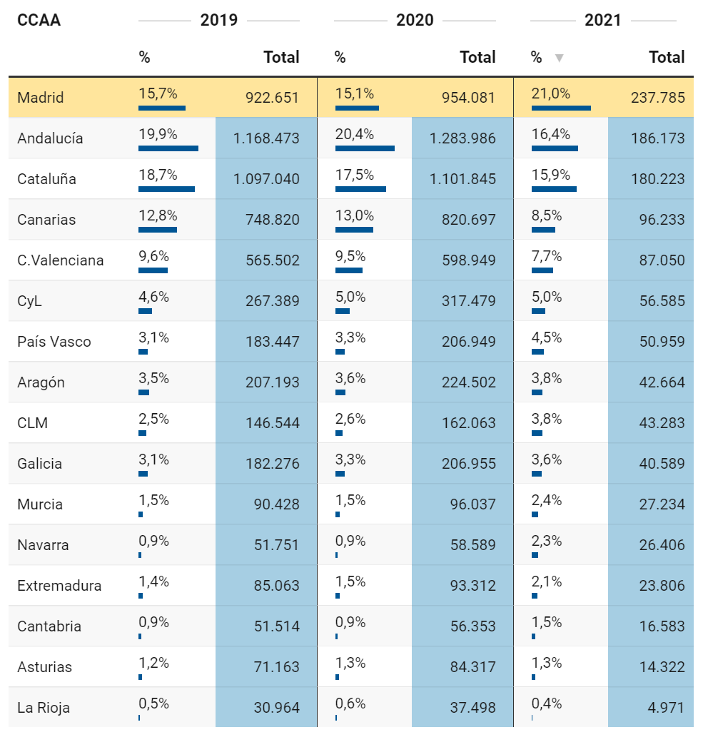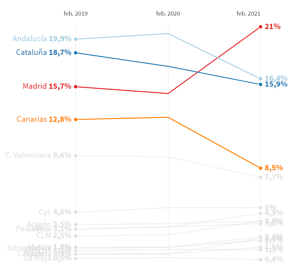 2月份,马德里大区成为西班牙接待游客量第一的地方,而这并不是马德里通常占据的位次。在2019年或2020年的2月份,在游客接待量方面,马德里排在加泰罗尼亚和安达卢西亚之后。但在这个疫情流行的年份里,形势发生了变化。根据西班牙国家统计局公布的酒店旅游状况调查数据显示,马德里接待的外国和国内游客比其他任何大区都多。 近3年2月份各大区接待的游客总数(国外和国内)占当月全国游客总数的百分比 具体来看,今年2月份有19.52万国内游客和4.26万国际游客到马德里旅游,而到访加泰罗尼亚的国内和国外游客人数分别为13.9万和4.12万,位居第二。 马德里大区自诩拥有全国最宽松的限制措施,虽然它的疫情现状并不是最好的,但是马德里的许多酒吧、餐馆和文化中心已经开放了数周,并吸引了许多游客,其中国际游客主要是法国人,他们正在逃避本国的限制。有报道称,最近几周周末,有许多年轻人为了追求 “以前的生活”而来到马德里,要进入西班牙,政府只要求他们有一个核算核酸阴性的证明,哪怕西班牙本国人在各省之间的流动都会受到限制。 近三年各大区2月份接待游客总量 面对反对派的批评,Ayuso为马德里开放接待游客辩护。“如果有人想从洛格罗尼奥,巴黎或其他任何地方来,如果游客们遵守规则,如果巴拉哈斯机场安全,那么我认为他们的到来,是一件推动经济发展的好事” 。 西班牙国家统计局估计今年2月马德里开始营业的酒店有717家,去年同期为1232 家。马德里酒店运营比例达到60%,而该大区的酒店入住率在西班牙也处于领先地位(24%,全国平均水平为17%)。 加那利群岛和巴利阿里群岛正在为夏季旅游预热 马德里是在疫情的影响下被更多游客选中,但是夏季旅游旺季,旅游业得到复苏的仍将会是西班牙的主要旅游目的地的:岛屿和地中海沿岸。 在过去的几周里,有两个消息促进了国外游客的预订量。德国将西班牙多个地区(包括巴利阿里群岛、瓦伦西亚、卡斯蒂利亚-拉曼查、埃斯特雷马杜拉、拉里奥哈和穆尔西亚)从风险地区名单中删除,同时西班牙则在复活节取消了对来自英国的航班的限制,但规定旅客在入境时提供核酸阴性证明。 这刺激了英国和德国的预订量,根据Mirai编制的数据,今年第8周的预订量猛增,甚至高于疫情爆发前的2019年。但这并没有持续多久,因为英国再次收紧了出境限制,西班牙主要客源地之一的德国也建议不要进行不必要的旅行。 原文翻译自eldiario.es
